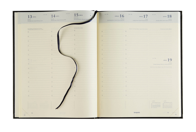 * Dimensions: 21x27cm. * Répartition par demi-heure de 8 à 22 heures. * Coins perforés. * Papier 90g de couleur crème. * Impression en deux couleurs. * Calendrier mensuel sur chaque page. * Espace supplémentaire pour notes et numéros de téléphone. * Couverture de luxe en similicuir. * Certificat FSC. * 6 langues NL-F-GB-D-ES-IT.