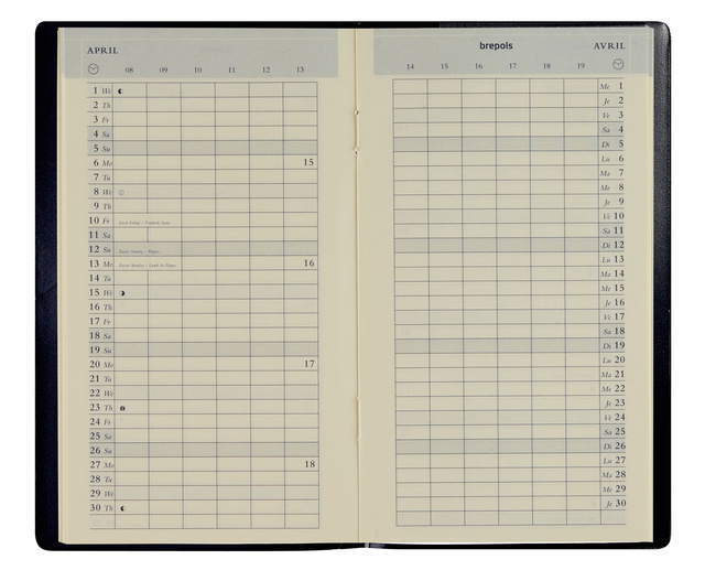* Format : 165x100x9mm. * L'agenda Plan-O-Rama de Brepols est idéal pour avoir un aperçu mensuel. * 1 mois sur 2 pages. * Disponible en différentes couleurs: noir, bleu et rouge, couleur livrée au hasard.