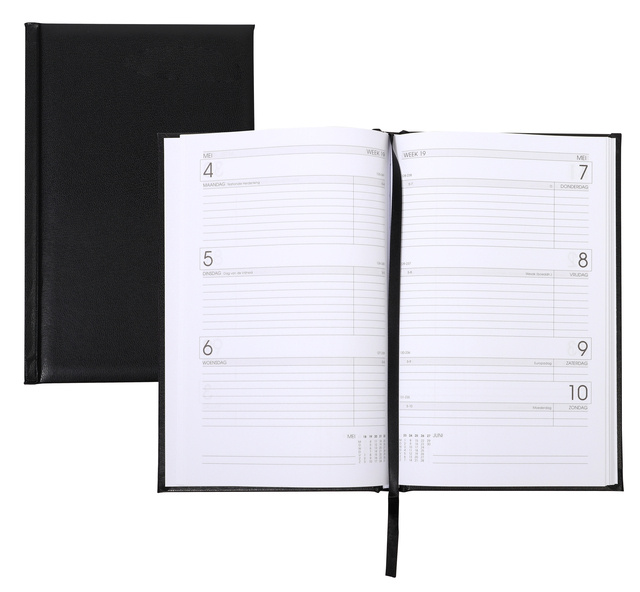 * Dimensions : 135x210mm. * Pas de plage horaire. * Coin perforé. * Signet. * Papier 70g. * Impression en 2 couleurs. * Calendrier 12 mois. * Calendrier mensuel sur chaque page. * Espace supplémentaire pour notes et téléphones. * Liste adresse de 8 pages reliée. * Texte en néerlandais.