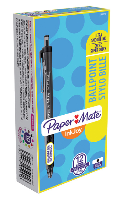 * Le Paper Mate Inkjoy 300RT. * Inkjoy est un système d’encre révolutionnaire permettant une écriture immédiate et équilibrée. Inkjoy garantit des lignes fluides et justes à la moindre pression de la main. * Le grip triangulaire caoutchouté augmente confort et contrôle. * Le corps en couleur et transparent donne une impression fraîche. * La pointe rétractable facilite l’usage. * Largeur de trait Medium. U.E.: boîte de 12 pièces.