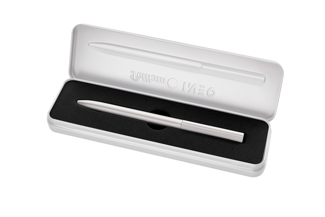 * INEO, la nouvelle série d'instruments d'écriture de Pelikan, est unique et saisissante. * La collection se caractérise par un design unique. * La surface sablée apporte une finition mate aux stylos anodisés colorés, ce qui les fait briller à la lumière. * Le look est minimaliste avec des couleurs sobres et un traitement de haute qualité des matériaux naturels. * Le détail particulier de l'Ineo est l'absence de clip. * Une caractéristique qui le différencie des autres instruments d'écriture de ce type et qui attire l'attention dans la vie de tous les jours. * Stylo bille à mécanisme rotatif dans un étui cadeau en métal. * Recharge remplaçable king-size avec encre bleue, infalsifiable, conforme à la norme ISO 12757-2.
