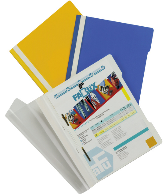 * Couverture transparente, face arrière en plastique opaque coloré. * Extra large, elle peut donc contenir des pochettes de présentation. * Avec une étiquette inscriptible sur la longeur de la chemise. * Convient pour papier format A4.