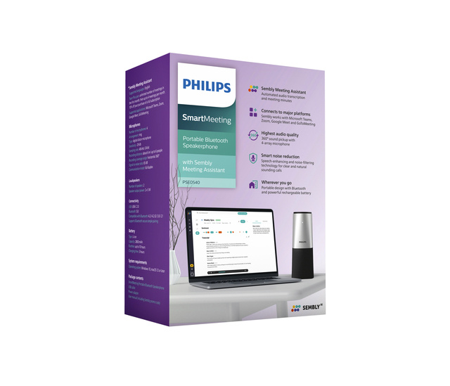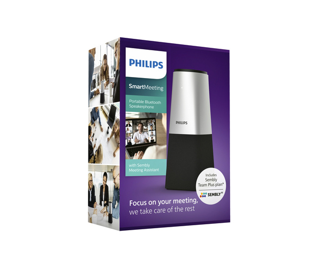 * Le microphone de conférence Philips SmartMeeting et l’assistant de réunion Sembly sont vos partenaires attitrés en réunion pour la prise de notes. La technologie intelligente d’amélioration de l’intelligibilité et de filtrage du bruit du microphone garantit des appels au son clair et naturel. * Sembly génère des transcriptions et des résumés automatiques, tout en soulignant pour vous les plans d’action et les choses à faire. Cette solution vous permet de savoir rapidement et facilement ce qui a été dit, et par qui, après chaque réunion, même si vous n’y avez pas assisté. * Prise de notes automatique pour vous permettre de vous concentrer sur les réunions. * Résumé instantané de la réunion pour en connaître l’issue en un coup d’œil. * Plans d’action automatisés en fin de réunion afin de gagner du temps. * Séparation claire des locuteurs grâce à l’identification vocale. * Sembly est compatible avec toutes les principales plate-formes telles que Microsoft Teams, Google Meet, Zoom et GoToMeeting. * Enregistrement à 360° et réseau de 4 microphones haute qualité pour des enregistrements de réunion cristallins. * Haut-parleur haute qualité pour une compréhension des voix en toute clarté. * Connectivité « Plug-and-Play » par Bluetooth ou USB pour une configuration facile. * Design portable et batterie puissante, pour des réunions en toute flexibilité, même lors de déplacements. * Votre microphone de conférence portable est fourni avec : - Microphone de conférence portable SmartMeeting - Câble USB - Adaptateur d’alimentation - - Manuel de l’utilisateur. code de licence Sembly inclus pour 1 mois de test gratuit, puis jusqu'à 4 réunions par mois. * 10% de réduction si vous achetez un abonnement complet.