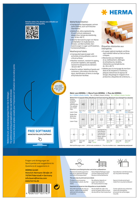 * Etiquettes en papier spécial résistant aux intempéries, adhésives, sur feuille A4, 80 feuilles par paquet. * En papier spécial blanc imprégné, extrêmement adhérentes, même sur des surfaces critiques. * Idéales pour des étiquetages fortement exposés et à l'extérieur. * Hydrofuges, oléofuges et antisalissantes, résistantes au vieillissement et à l'eau de mer. * Résistantes aux températures de -30 à +80°C. * Support en cellulose blanchie sans chlore, colle sans solvant. * Pour imprimantes laser et photocopieuses. * Ne conviennent pas aux imprimantes jet d'encre, imprimantes couleur laser et photocopieuses couleur. * Outils logiciels gratuits : www.herma.com/software.