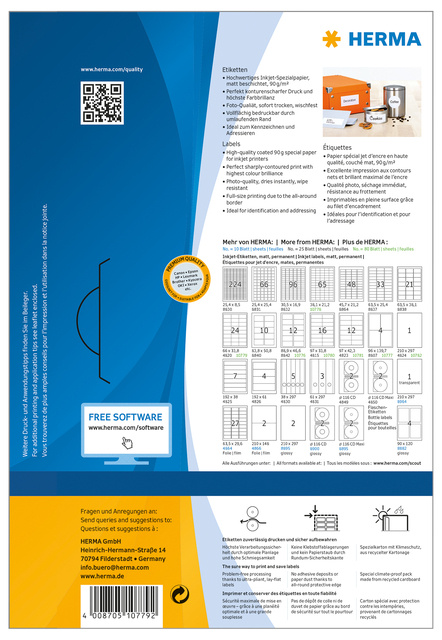 * Etiquettes spéciales pour imprimantes jet d'encre, sur feuilles A4, adhésives, 80 feuilles par pqauet. * En papier couché spécial de grande qualité, 90g/m², pour des impressions brillantes aux contours nets en qualité photo. * Passage sans incident grâce aux bords de sécurité sur le pourtour et à une planéité optimale. * Les modèles avec bords sur le pourtour : imprimables en pleine-surface et idéales aussi pour imprimantes jet d'encre avec guide-papier critique. * Outils logiciels gratuits : www.herma.com/software.
