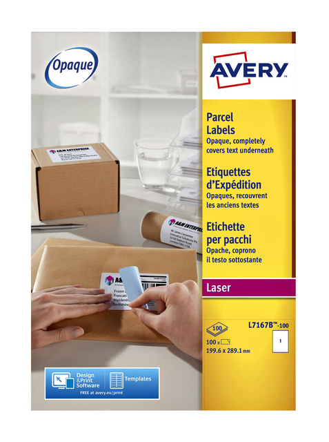* Etiquettes d’expédition Avery avec la technologie BlockOut™ (opaque), choix idéal pour l’envoi de grosses enveloppes, tubes d’envoi et colis. * Etant donné qu’elles recouvrent parfaitement les anciens textes ou étiquettes par leur opacité, elles sont économiques, les emballages peuvent être réutilisés. * Les étiquettes sont fabriquées à partir de papier certifié FSC®. * En plus de cela, elles sont résistantes et restent collées sur les colis de façon permanente. * Qu’elles soient imprimées en noir et blanc ou en couleur, ces étiquettes ultra blanches sont très visibles sur les paquets. * La garantie JamFREE™ – valable sur toutes nos étiquettes laser – pour imprimer sans aucun problème de passage dans votre imprimante. * Ces étiquettes d’expédition sont également dotées de la technologie spéciale QuickPEEL™ pour une utilisation facile et une application plus rapide. * Eliminez rapidement les perforations sur la feuille afin de libérer l’étiquette et appliquez-la sur votre paquet. * L’étiquetage est beaucoup plus rapide. * Envoyez le bon message avec une étiquette proprement imprimée grâce à Avery Design & Print online, logiciel gratuit afin de personnaliser vos étiquettes avec votre logo ou autres. * Modèles et logiciel gratuits sur avery.eu.