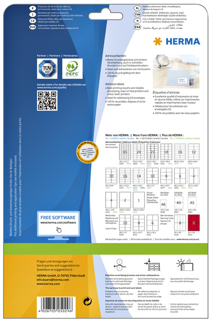 * Etiquettes adhésives universelles sur feuilles A4, adhérence permanente. * 25 feuilles par emballage. * Parfaites pour toutes les imprimantes laser et jet d'encre, photocopieuses, imprimantes laser couleur et photocopieuses couleur. * Garanties sans bourrage et compatibles avec les grandes vitesses grâce à un matériau composite spécial extra fort, excellente planéité et bords de sécurité sur le pourtour. * Passage sans problème dans les imprimantes laser et jet d'encre, testé et confirmé par TÜV SÜD. * Haut degré de blanc et surfaces régulières pour d'excellentes impressions en noir et en couleur. * Sensiblement plus épaisses : étiquettes extra fortes - collage aisé. * Adhérence particulièrement rapide et fiable, même sur des surface froides et humides. * Ecologique et durable : blanchi sans chlore, certifié PEFC, colle autoadhésive sans solvant. * Les étiquettes sont 100 % recyclables avec les vieux papiers, emballage en carton recyclé. * Outils logiciels gratuits : www.HERMA.com/software.
