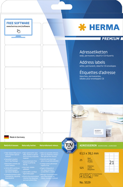 Etiquette HERMA 5029 Premium A4 63,5x38,1mm 525 pièces blanc