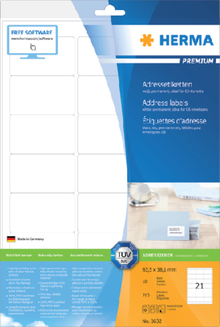 * Etiquettes blanches autocollantes sur feuilles A4, adhérence permanente. * Spécialement conçues pour une utilisation sur toutes les imprimantes laser et jet d’encre ainsi que les copieurs. * Garanties sans bourrage et compatibles à grande vitesse grâce à un matériau composite spécial extra fort, excellente planéité et bords de sécurité sur le pourtour. * Passage sans problème dans les imprimantes laser et jet d'encre, testé et confirmé par TÜV SÜD. * Haut degré de blanc et surfaces régulières pour d'excellentes impressions en noir et en couleur. * Sensiblement plus épaisses: étiquettes extra fortes - collage facile. * Adhérence particulièrement rapide et fiable, même sur des surfaces froides et humides. * Écologique et durable : blanchi sans chlore . * Certifié PEFC. * Ecologique et durable : blanchi sans chlore. * Logiciel gratuit: www.HERMA.com/software.