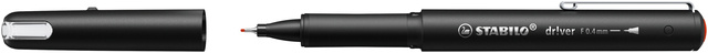 * Le fineliner STABILO dr!ver est le stylo idéal pour toutes les occasions d'écrire. * Au bureau, pendant les études ou à la maison, ce fineliner est un stylo intemporel et élégant. * La pointe, d'une largeur de 0,4 mm, s'adapte à la pression d'écriture pour une expérience d'écriture optimale. * Le stylo peut facilement être emporté dans votre poche ou votre sac sans tacher ou se perdre, grâce au capuchon et à l'agrafe en métal. * Couleur d'écriture : rouge.
