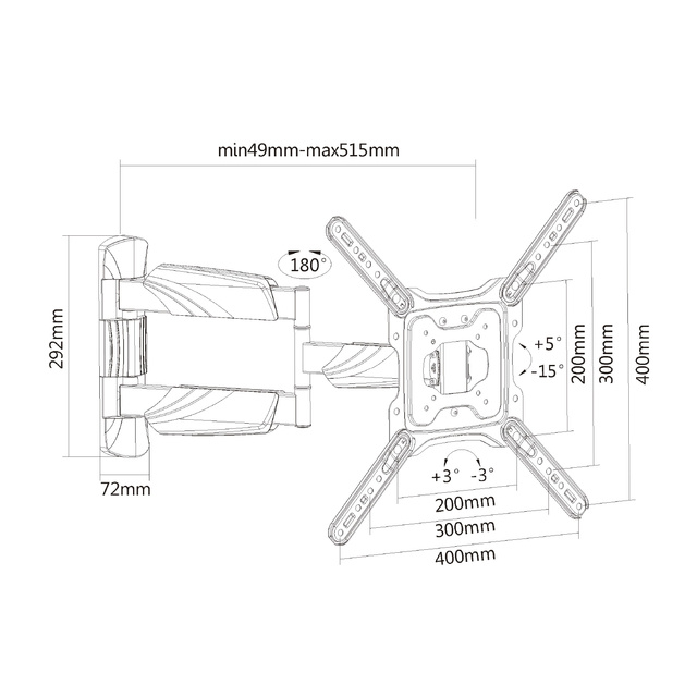 * Le support mural AC8354 Full Motion pour téléviseur est la solution idéale pour fixer votre téléviseur (23 pouces à 55 pouces, poids maximum 35 kg) au mur. * Le support convient à tous les téléviseurs avec une norme de montage VESA 75x75, 100x100, 200x100, 200x200, 300x200, 300x300, 400x200, 400x300, 400x400. * Le téléviseur peut s'incliner vers le haut/bas avec un angle de +5°/-12° et pivoter vers la gauche/droite avec un angle de +15°/-15°. * Le support mural AC8354 possède 3 points de pivot avec une extension maximale de 51cm. * Tournez le téléviseur dans n'importe quelle direction pour obtenir le meilleur angle de vue. * De plus, le AC8354 dispose également d'un réglage de niveau de +3°/-3°. Les câbles sont maintenus hors de vue grâce au système de gestion des câbles. * Le système de montage facile permet d'abord de fixer le support au mur. Ensuite, il faut fixer le support VESA au téléviseur et connecter le support VESA au support mural en reliant les boulons et les écrous.