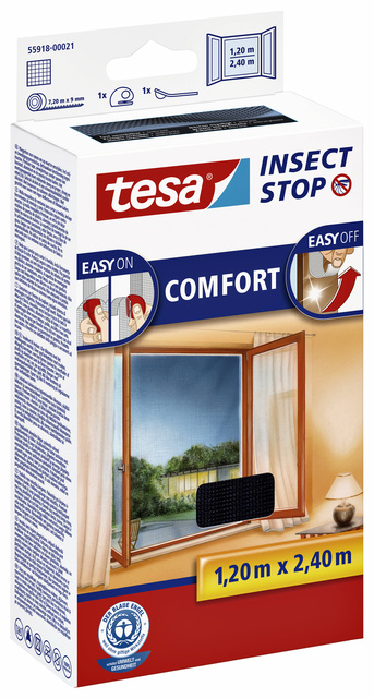 * Tesa Insect Stop Auto-agrippant Comfort pour fenêtres est une protection unique contre les insectes et les moustiques. * Le produit a un système Easy-on et Easy-off permettant de laisser la fenêtre ouverte tout en gardant les moustiques et insectes à l’extérieur. * Cette moustiquaire extrêmement efficace est disponible en deux couleurs et différentes dimensions, s’adapte sur la majorité des fenêtres. * Installation facile et rapide: collez la bande adhésive agrippante au cadre de la fenêtre, appliquez la moustiquaire dessus et le tour est joué. * Facile à enlever sans laisser de traces. * Résiste aux UV. * Lavable jusqu’à 30°C. * Moustiquaire réutilisable. * Couleur : anthracite. * Taille 120x240cm.