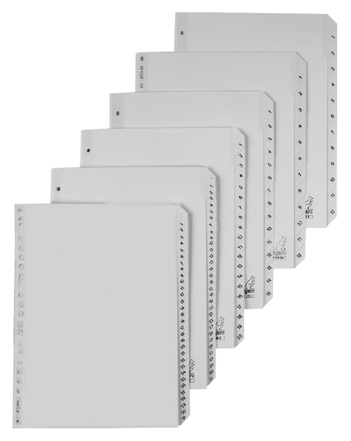 * Intercalaires en PP g 120 mµ. * Les onglets sont imprimés de numéros en noir d’un côté. * Emballé par set sous cellophane. * Disponible par set.​* Conseil de commande boîte de 25 sets.