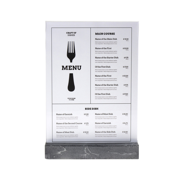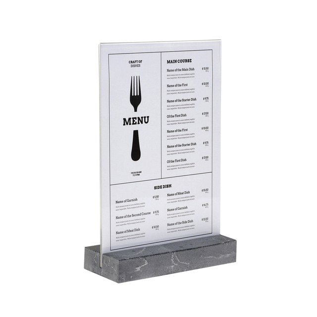 * Présentoir de table avec un luxueux socle en polystone anthracite lourd pour une présentation claire des menus, par exemple. * Fabriqué en acrylique transparent de haute qualité. * Présentation recto-verso. * Format A4 portrait. * Socle en T. * Poids :1,3kg.