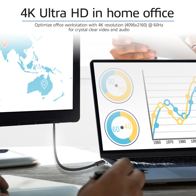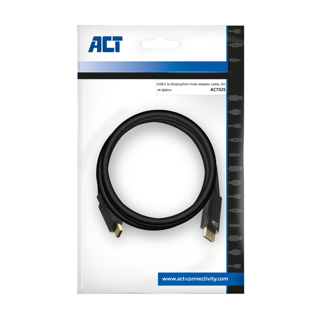 * Le câble adaptateur USB-C vers DisplayPort ACT AC7325 permet de connecter votre ordinateur portable avec une sortie USB-C à un moniteur ou un projecteur avec une entrée DisplayPort. * Le câble a une longueur de 2m. * La résolution maximale prise en charge est 4096x2160 pixels (4K) @ 60Hz. * Assurez-vous que le port USB-C de votre ordinateur portable est compatible avec le mode DP Alt. * Câble vidéo et audio de l'USB-C vers DisplayPort. * Connecteurs : USB-C mâle - DisplayPort mâle. * Plug and play : un port USB-C avec DisplayPort Alternate Mode (DP Alt Mode) est nécessaire.