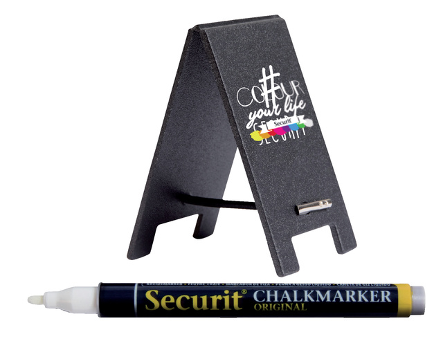 * Mini ardoise de table Securit en forme de panneau trottoir. * Inscriptible sur les 2 faces. * Grâce aux élastiques fournis avec, cette ardoise de table peut être placer partout. * Pour le meilleur résultat d’écriture, utilisez des feutres craies Securit. * L’ardoise est facile à nettoyer à l’aide d’un chiffon humide. * Le set comprend: 5 mini ardoises de table, 5 élastiques et un feutre craie blanc.