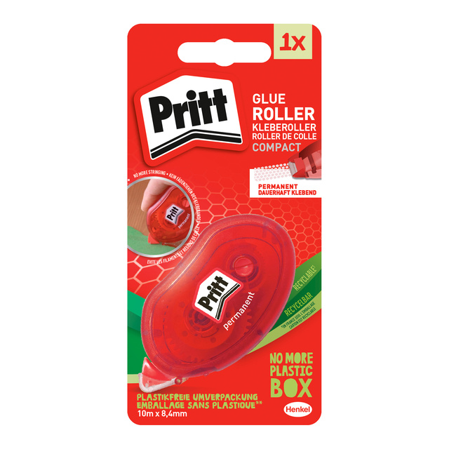 * Roller de colle compact Pritt Permanent - Avec bande alvéolée pour un collage net et précis! Vous recherchez un roller de colle solide et compact pour des applications rapides et propres? Le roller de colle Pritt Compact Permanent est facile à manipuler et garantit des collages permanents et instantanément résistants. La colle est très polyvalente et peut être appliquée sur de nombreux matériaux, y compris le papier, le carton, le verre, les photos et les matériaux synthétiques. C'est donc la colle idéale pour les loisirs créatifs. La conception du roller de colle est également intelligente et petite, ce qui le rend particulièrement léger et maniable, et très adapté à l'utilisation par les écoliers et les étudiants ou comme colle pratique dans le bureau. Les rollers de colle permanente Pritt Compact sont livrés avec un type spécial de ruban adhésif. Ce ruban adhésif à structure alvéolée adhère parfaitement et peut être appliqué avec précision et netteté. La colle est dotée d'un capuchon protecteur, ce qui permet de la ranger facilement. L'applicateur est 100% recyclable. * Les avantages du produit en quelques mots : * Roller de colle compact. * Léger et maniable. * Convient pour le papier, le carton, le verre, les photos et les matériaux synthétiques. * Adhésion permanente et immédiate. * Application propre et précise. * 100% recyclable. * Contenu : 8.4mmx10m.