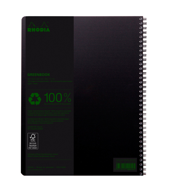 * Rhodiaactive Greenbook ligné - A4+ - 4 perforations - papier 90g FSC®. * Le Greenbook répond à toutes les exigences : beau, fonctionnel ET 100% recyclé et recyclable. Au bureau ou en déplacement, optez pour un carnet professionnel éco-responsable. * Sous l'élégante sobriété de la couverture noire en polypropylène recyclé, imprimée en vert, prenez vos notes sur le remarquable papier recyclé Clairefontaine 90 g/m2, d'une grande opacité et d'une blancheur naturelle supérieure. * Couverture en polypropylène 100% recyclé et recyclable, 160 pages microperforées et perforées (A4+ : perforation 4 trous / A5+ : perforation universelle 6 trous). * Produit sans désencrage ni traitement au chlore. Certification FSC® recyclé.