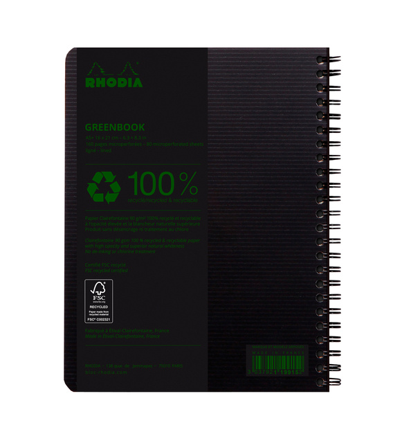 * Rhodiaactive Greenbook ligné - A5+ - 6 perforations - papier 90g FSC®. * Le Greenbook répond à toutes les exigences : beau, fonctionnel ET 100% recyclé et recyclable. Au bureau ou en déplacement, optez pour un carnet professionnel éco-responsable. * Sous l'élégante sobriété de la couverture noire en polypropylène recyclé, imprimée en vert, prenez vos notes sur le remarquable papier recyclé Clairefontaine 90 g/m2, d'une grande opacité et d'une blancheur naturelle supérieure. * Couverture en polypropylène 100% recyclé et recyclable, 160 pages microperforées et perforées (A4+ : perforation 4 trous / A5+ : perforation universelle 6 trous). * Produit sans désencrage ni traitement au chlore. Certification FSC® recyclé.