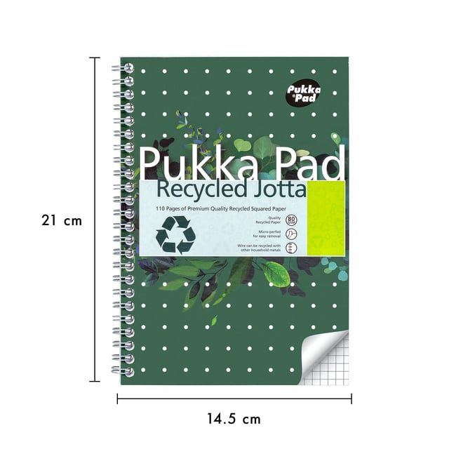 * La gamme de blocs-notes recyclés Pukka Pads reflète l'engagement de Pukka à créer des produits éthiques de haute qualité. Nous sommes fiers de proposer une gamme de blocs-notes recyclés de qualité supérieure pour vous aider à être durable et stylé. Les possibilités de nos blocs-notes sont infinies, que ce soit pour la rentrée des classes, l'université ou simplement pour laisser libre cours à vos idées. Nos blocs-notes A5 sont le complément idéal de votre assortiment de papeterie.... Pourquoi ne pas choisir une alternative écologique à votre bloc-notes habituel? Le bloc-notes recyclé a un format A5 de 145x210mm et est fabriqué en papier 100% recyclé de haute qualité (80g). Chaque bloc-notes contient 110 pages quadrillées de 5x5mm et un bord perforé pour les détachées facile. Le format A5 compact est idéal pour prendre des notes ou noter des rappels en déplacement, il se glisse facilement dans de nombreux sacs. Les blocs-notes recyclés sont vendus par lot de 3. Le plus, est que nos blocs-notes sont 100% recyclés, nous contribuons donc à la sauvegarde de la planète!