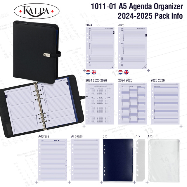 Organiseur Kalpa A5 inclusif agenda 2025-2026 7 jours/2 pages nervuré noir