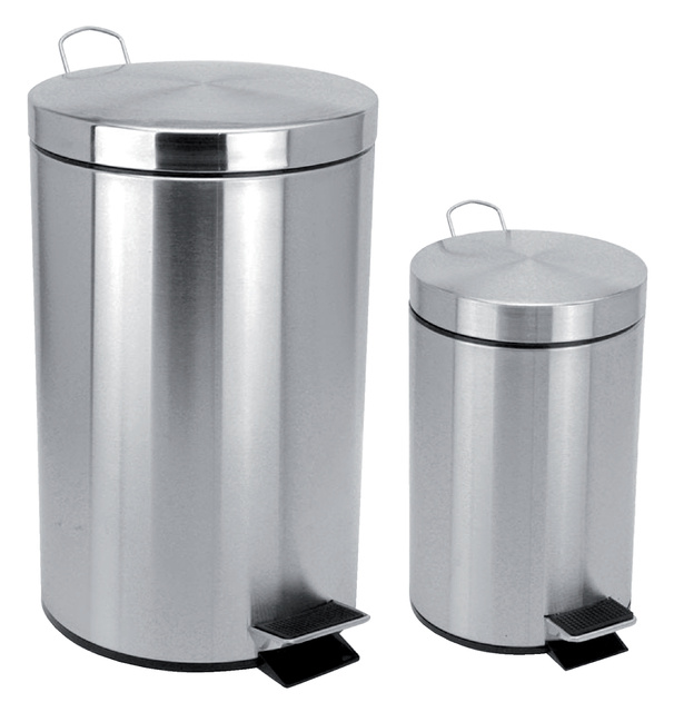 * Poubelle à pédale ronde avec liner intérieur plastique. * Acier inoxidable mat. * Disponible en petit modèle de 3 litres pour les toilettes et en grand modèle de 30 litres pour les cuisines.