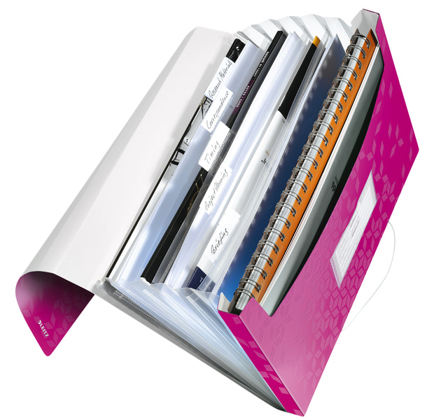 * Farde de projets Leitz WOW. * Capacité 200 feuilles format A4 (80g). * 6 compartiments extensibles avec étiquettes pour une identification aisée du contenu. * Pochette à l’avant pour garder des accessoires ou un bloc-notes. * Une fermeture élastique attrayante pour un transport de vos documents sécurisé. * Peut être combiné avec chemises standard, bloc-notes WOW et Leitz CombiFiles.