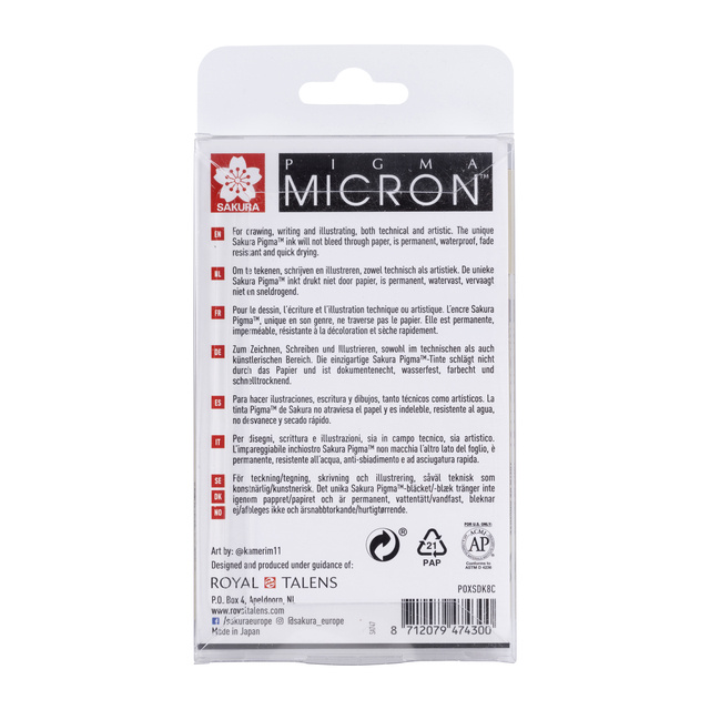 * Pigma Micron est le premier fineliner professionnel au monde doté d'une encre pigmentée à base d'eau. * L'encre Pigma sèche rapidement, ne traverse pas le papier et sèche résistante à l'eau. * Convient à toutes les surfaces de papier de couleur claire. * La pointe en métal permet d'utiliser le fineliner avec régle et pochoirs. * Set de 4 Pigma Micron et feutre pinceau gris frois clair et gris froid : Pigma Micron 01 (0,25mm), Pigma Micron 05 (0,45mm), Pigma Micron 10 (0,60mm) et Pigma Brush. * Ces nuances de gris superposables vous permettent d’ajouter des ombrages, de la profondeur, des accents visuels et des effets de couche à vos illustrations, dessins, feuilles de Bullet Journal, et bien plus encore.
