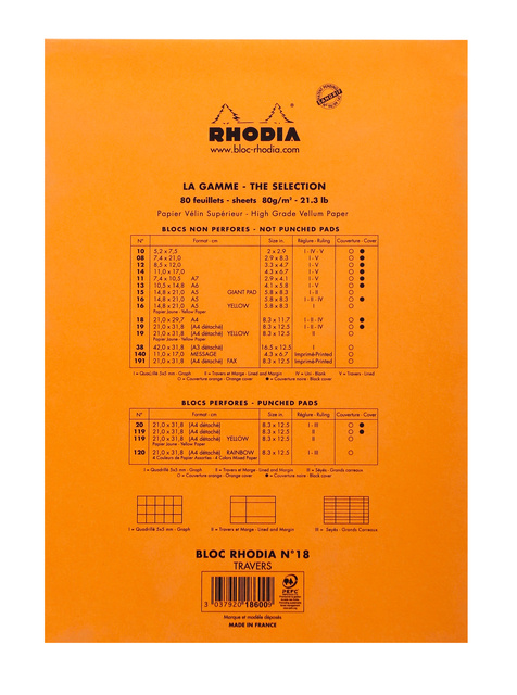 * Bloc Rhodia N°18, 21x29,7cm, 80 feuilles de papier lignées avec marge. * Ultra-fonctionnel, le bloc-notes Rhodia est "La" référence des blocs agrafés! * 80 feuilles détachables avec microperforation. * Fond cartonné robuste pour prendre des notes même sans support. * Papier vélin fin Clairefontaine 80g, certifié PEFC.