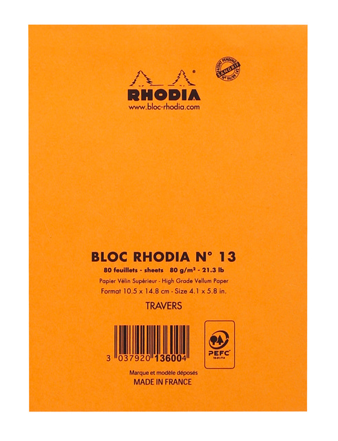 * Bloc Rhodia N°13 agrafé, 10,5x14,8cm, 80 feuilles de papier lignées. * Ultra-fonctionnel, le bloc-notes Rhodia est "La" référence des blocs agrafés! * 80 feuilles détachables avec microperforation. * Fond cartonné robuste pour prendre des notes même sans support. * Papier vélin fin Clairefontaine 80g, certifié PEFC.