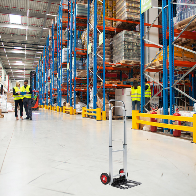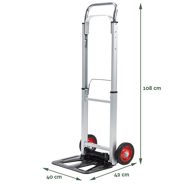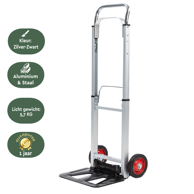 * Un peu d'aide pour les travaux lourds n'est jamais superflue. Grâce à ce diable robuste, déplacer des cartons et des objets lourds jusqu'à 90kg ne pose aucun problème. Cadre en aluminium léger et pliable. Le cadre en aluminium robuste garantit un poids léger de 5,7kg. Ce chariot est également pliable et peut donc être emporté partout. Ce n'est pas un luxe lorsqu'un soutien supplémentaire est nécessaire. * Plate-forme en acier robuste et roues en TPR non marquantes. La surface de transport en acier est conçue pour résister aux chocs et peut supporter une charge allant jusqu'à 90kg. De plus, ce chariot est équipé de roues TPR robustes. Le TPR (caoutchouc thermoplastique) est un matériau léger et facile à utiliser. Il ne laisse pas de traces sur le sol, a un effet insonorisant et est très résistant à l'usage. * Dimensions déplié (LxlxH): 42x40x108cm. * Dimensions plié (LxlH) : 19x40x71cm * Dimensions surface de chargement (Lxl) : 24x40cm. * Diamètre des roues 15cm. * Poids du produit : 5,7kg.