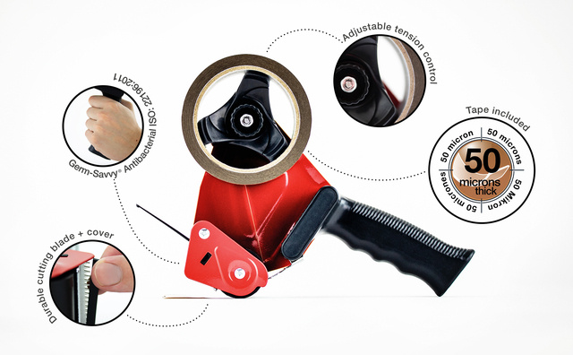 * Le dérouleur de ruban adhésif Rapesco 960 facilite tous les travaux difficiles et les opérations d'emballage. * Ce dérouleur solide et pratique a une construction en acier et une prise moulée résistante aux chocs, facile à utiliser, avec une poignée ergonomique en forme de pistolet. * Avec la protection antibactérienne Germ-Savvy® intégrée, le 960 est parfait pour une utilisation partagée. * Doté d'un régulateur de tension du ruban réglable et d'un guide de position et de sécurité, ce distributeur est compatible avec tous les types de ruban d'emballage standard jusqu'aux rouleaux de 50mmx60m. * Livré avec un rouleau de ruban d'emballage marron de 50mmx50m adhérant à une large gamme de surfaces. * Ce modèle est garanti 3 ans.