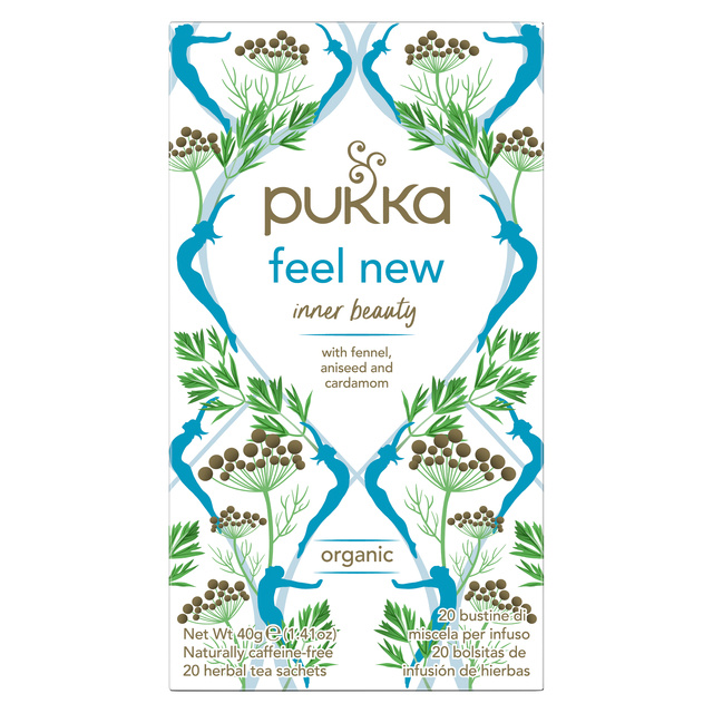 * Pukka Feel New est un mélange de graines d'anis, de graines de fenouil, de gousses de cardamome, de réglisse, de graines de coriandre et de racine de curcuma. * Fabriqué à partir d'ingrédients 100% biologiques cultivés de manière durable. * Pour donner vie à ces délicieuses épices, il suffit de les faire infuser dans de l'eau fraîchement bouillie pendant 15 minutes. * Une boîte contient 20 sachets de thé emballés individuellement et entièrement biodégradables.