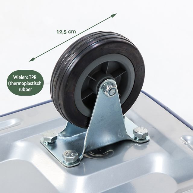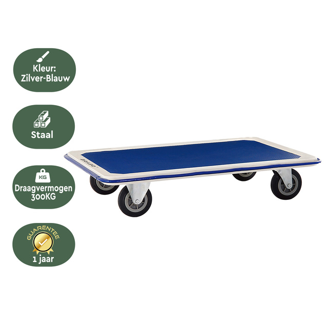 * Ce chariot plate-forme, également appelé chariot de meubles, est fabriqué à partir d'un cadre en acier de haute qualité et durable et a une capacité de charge de 300 kilos. Le cadre en acier garantit la résistance et la longévité de l'appareil. Par ailleurs, le dessus de ce chariot pratique est recouvert d'une couche antidérapante en caoutchouc. Cette couche antidérapante garantit que la charge placée sur le chariot ne bouge pas pendant le transport. Le chariot est équipé de 2 roues pivotantes. Cela vous permet de manœuvrer le chariot plate-forme facilement et rapidement là où vous le souhaitez. * Assemblage : L'article peut être assemblé à l'aide de vis afin de faciliter l'exécution de travaux lourds. * Capacité de charge : 300kg * Matériau des roues : TPR (caoutchouc thermoplastique) Matériau du noyau des roues : PP (polypropylène) * Diamètre des roues : 12,5cm * Nombre de roues : 4. * Garantie : 1 an.