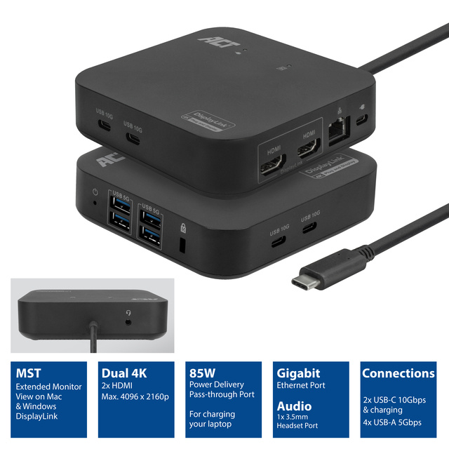 * La station d'accueil AC7150 USB-C transforme votre ordinateur portable Windows ou votre MacBook en une station de travail complète en connectant un seul câble USB-C. * Grâce à la technologie DisplayLink® intégrée, vous pouvez connecter jusqu'à deux écrans 4K supplémentaires pour une vue étendue du moniteur sur les ordinateurs Windows et Apple. * La station d'accueil est équipée d'un port LAN Gigabit, de 2 ports USB-C, de 4 ports USB-A, d'un port pour casque et d'un emplacement de sécurité. * L'AC7150 est alimenté par USB via le câble USB-C fourni. * Connectez le chargeur USB-C de votre ordinateur portable au port de passage Power Delivery pour charger votre ordinateur portable. * La station d'accueil ACT USB-C 4K a satisfait à toutes les exigences du programme de logo certifié DisplayLink. * L'AC7150 est une station d'accueil compacte pour le travail et les voyages avec un câble USB-C fixe de 1 mètre. * Deux écrans 4K supplémentaires et l'écran de votre ordinateur portable étendent votre espace de travail à un total de trois écrans. * Transformez votre ordinateur portable Windows ou votre MacBook en une station de travail complète avec un seul câble USB-C : Cette station d'accueil vous offre un ensemble complet pour transformer votre ordinateur portable en une station de travail complète en connectant un seul câble USB-C à votre ordinateur portable. Connectez jusqu'à deux moniteurs 4K (résolution maximale 4096x2160p @ 60Hz) à l'aide des ports HDMI. La station d'accueil est équipée d'un port réseau Gigabit LAN, d'un port pour casque et d'un emplacement de sécurité. L'AC7150 ajoute 6 ports USB supplémentaires à votre ordinateur portable : deux ports USB-C (10Gbps) et quatre ports USB-A (5Gbps).* Technologie DisplayLink® : vue étendue du moniteur pour les ordinateurs MacOS et Windows : La station d'accueil AC7150 est dotée de la technologie DisplayLink®. Le bureau de votre appareil peut être étendu à deux écrans supplémentaires. Vous disposez ainsi d'un total de trois écrans (1 ordinateur portable, 2 écrans). Cette technologie fonctionne avec n'importe quel ordinateur Windows ou macOS qui prend en charge l'USB-C.