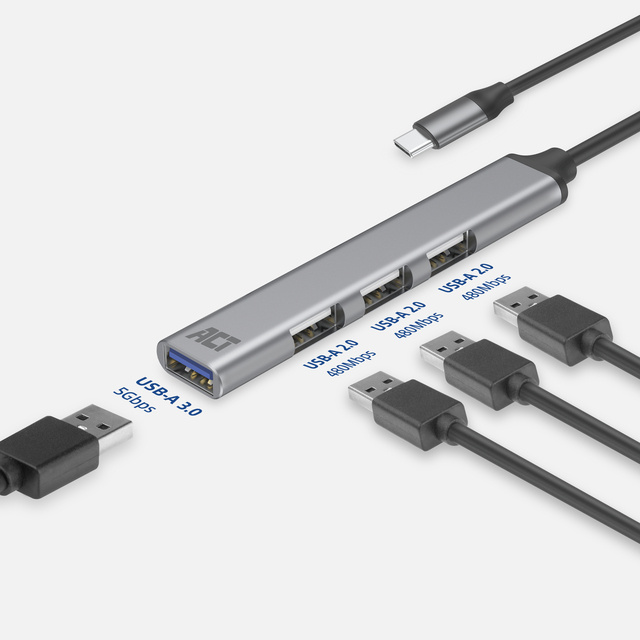 * Connectez des périphériques USB-A à votre ordinateur portable USB-C : Le hub USB ACT AC6425 ajoute quatre ports USB-A (1x USB 3.0 5Gbps et 3x USB 2.0 480Mbps) à votre ordinateur portable ou ordinateur avec USB-C pour connecter des périphériques USB-A.