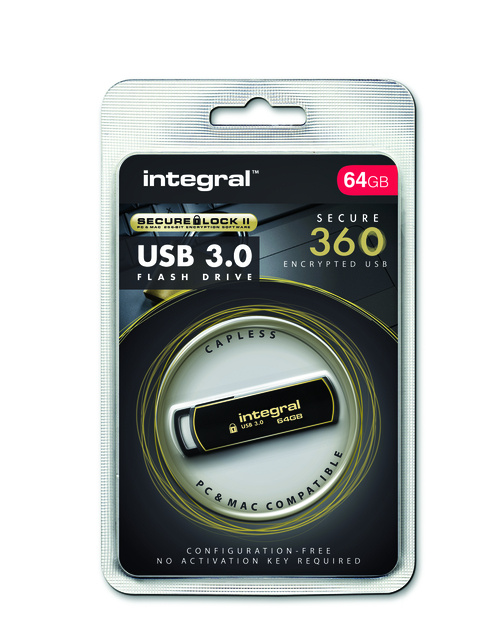 * L'Integral Secure 360 USB 3.0 contient le logiciel de cryptage AES 256 bits 'Secure Lock II', qui vous permet de protéger vos données précieuses et sensibles lors de vos déplacements. * Secure Lock II est doté d'une interface facile à utiliser pour le cryptage à tout moment pour PC et Mac. * Logiciel de cryptage AES 256 bits "Secure Lock II". * Protection intelligente. * Les données sont automatiquement effacées après 10 tentatives d'accès échouées. * Le dispositif est alors réinitialisé et peut être utilisé à nouveau. * Sans configuration. * Secure Lock II ne nécessite aucune clé d'activation du logiciel pour être utilisé, il fonctionne dès sa sortie de la boîte. * Une clé USB SuperSpeed signifie que vous passez moins de temps à attendre et plus de temps à profiter de votre contenu. * Idéal pour les fichiers volumineux, les films HD, les sauvegardes et la mise à niveau des systèmes PC. * Rétrocompatible avec les systèmes USB 2.0.