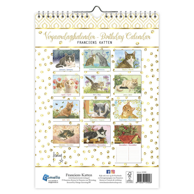Ce calendrier d'anniversaire luxueux et élégant de Francien's Cats présente chaque mois un magnifique dessin d'un des chats de Francien van Westering. Le calendrier est facile à accrocher grâce à la reliure à anneaux munie d'un œillet de suspension en haut. Francien van Westering, l'artiste féline la plus connue des Pays-Bas, écrit et dessine depuis toujours sur les chats et les félins. Elle sait comme personne transmettre avec précision non seulement l'apparence mais aussi le caractère de ses chats. * Format A4 (21x30cm).