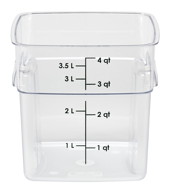 * Révolutionnez votre cuisine avec le récipient de stockage des aliments CamSquares FreshPro series 3,8 litres de Cambro, fabriqué en Camwear durable. Avec ses prises intégrées, le récipient prend moins de place que les options de stockage conventionnelles et peut être facilement transporté en cas de besoin. Les coins arrondis et la prise texturée du FreshPro garantissent un transvasement sûr des quatre côtés et une manipulation plus aisée. Le système de code couleur, avec des couvercles assortis (vendus séparément), des égouttoirs et des graduations faciles à lire, offre une vue d'ensemble des stocks et une facilité d'utilisation, ce qui est essentiel pour les cuisines au rythme effréné. Grâce à sa construction en polypropylène, le récipient est très durable et résistant aux taches, aux dommages causés par les acides et à la rétention d'odeurs. * Dimensions : 187x185x185mm. * Plage de température : -40°C à +70°C. * Poids : 370 grammes. * Lavable au lave-vaisselle.