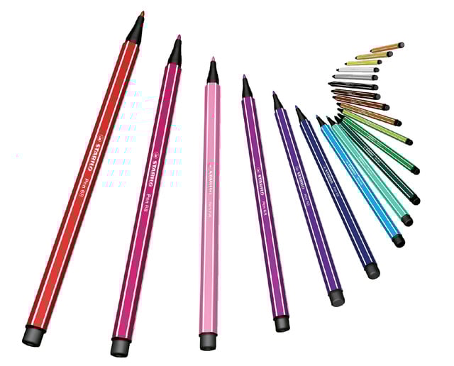 Le Pen 68 est disponible dans un grand nombre de couleurs vives, y compris des tons néon et pastel. Cette diversité garantit une créativité permanente - c'est pourquoi le STABILO Pen 68 s'inscrit parfaitement dans les tendances actuelles telles que le handlettering, le journaling ou le sketchnote. Les amateurs d'art mandala et tous ceux qui préfèrent dessiner ou peindre seront également enthousiasmés par la polyvalence de ce stylo-feutre de haute qualité. La pointe robuste permet d'obtenir des couleurs homogènes et est parfaite pour tracer facilement des lignes épaisses ou remplir de grandes surfaces. La pointe peut rester décapuchonnée jusqu'à 24 heures sans sécher, ce qui est idéal pour travailler sur votre projet créatif. Les couleurs peuvent être mélangées avec de l'eau pour obtenir de magnifiques effets d'aquarelle. Le Pen 68 est plus durable que jamais : désormais, le capuchon et le corps du stylo sont composés à 96% de plastique biosourcé, conformément à l'approche du bilan de masse.