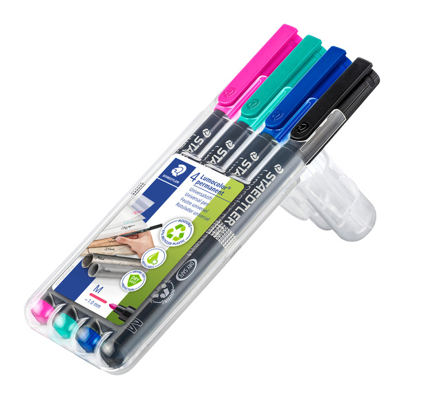 * Feutre Lumocolor 317 Medium permanent. * Pour une utilisation sur la plupart des surfaces, convient pour la rétroprojection. * Convient également pour écrire sur CD et DVD. * Excellente résistance à l’eau et aux frottements sur la plupart des surfaces. * Séchage en quelques secondes, idéal pour les gauchers. * Encre permanente quasi inodore. * Encre DRY SAFE : le feutre peut rester ouvert plusieurs jours sans sécher (test ISO 554). * Sans xylène ni toluène. * Largeur de trait M, medium (environ 1mm). * Rechargeable. * Boîte chevalet de 4 couleurs. * Le noir résiste à la lumière et aux intempéries. * Corps fabriqué à partir de 97% de plastique recyclé (corps, capuchon et embout)