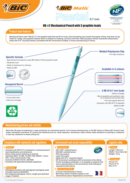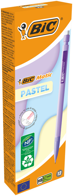 * Crayon graphite BIC Matic HB 0,7mm en 5 couleurs pastel très tendance. * Le portemine idéal pour prendre des notes temporaires et des rendez-vous, et parfait pour le carnet à puzzles et, bien sûr, pour dessiner et/ou faire des croquis. * L'avantage d'un portemine est qu'il n'est pas nécessaire de tailler la pointe. * Le portemine a un capuchon en gomme et dispose de 3 mines HB en graphite très résistantes. * Le portemine BIC Matic est à la fois un crayon, un taille-crayon et une gomme * Les portemine BIC Matic Pastel sont certifiés par le label NF ECO et sont composés à 57% de matériaux recyclés. * Boîte de 12 portemines, 5 couleurs pastel.