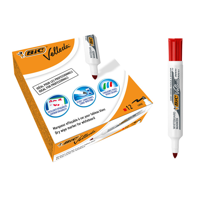 * Ces marqueurs BIC Velleda 1711 sont des outils parfaits pour des présentations impressionnantes. * Ils ont été spécialement développés pour les bureaux et les écoles qui utilisent des tableaux blancs BIC Velleda. Ces marqueurs de haute qualité assurent une excellente précision à long terme. * La pointe ogive en acrylique (0,6mm) permet d'obtenir des lignes larges de 1,9mm. * L'encre à pigments peut être effacée sans trace. * Une qualité sans compromis est garantie car ces feutres pour tableaux effaçables à sec sont produits dans les usines BIC selon le savoir-faire inégalé de l'entreprise. * Sans PVC.