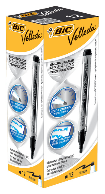 * BIC Velleda Liquid Ink Pocket Marker. * Pointe ogive durable. * Encre à base d’alcool. * Techonologie encre liquide. * Effaçable, même après quelques jours. * Peu d’odeur. * Corps plastique. * Pointe medium. * Sans PVC.