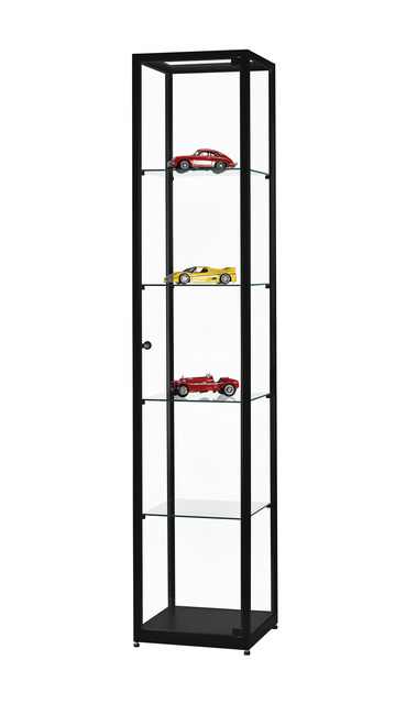 * Profil en aluminium angles droits, 24mm. * Techniquement anodisé. * Profils transversaux en haut et en bas de 40mm. * 4 étagères en verre flotté 5mm, réglage en continu. * Pas d'éclairage. * 1 porte battante avec serrure. * Verre de sécurité trempé sur tout le pourtour. * Avec pieds réglables. * Dimensions extérieures: 400x400x1984mm. * Couleur: noir.