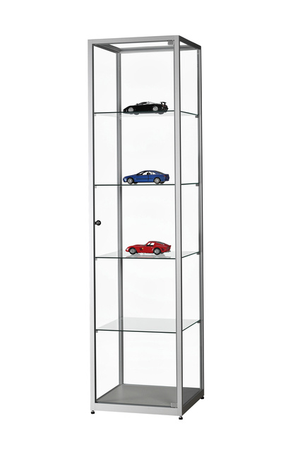 * Profil en aluminium angles droits, 24mm. * Argent anodisé. * Profils transversaux en haut et en bas de 40mm. * 4 étagères en verre flotté 5mm, réglage en continu. * Pas d'éclairage. * 1 porte battante avec serrure. * Verre de sécurité trempé sur tout le pourtour. * Avec pieds réglables. * Dimensions extérieures: 500x500x1984mm. * Fond en bois gris clair. * Couleur: gris argenté.