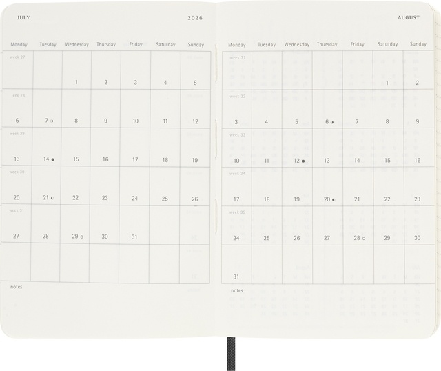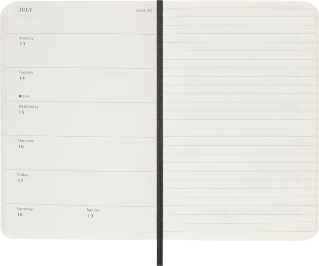 Le semainier Moleskine est daté de janvier à décembre. Il s'agit d'un agenda pratique et polyvalent qui offre la liberté d'un carnet de notes. Les rendez-vous de la semaine figurent sur le côté gauche et une page lignée pour les notes sur le côté droit. Le carnet est disponible avec une couverture rigide ou souple, des coins arrondis et une fermeture élastique. * Couverture souple, angles arrondis, fermeture à élastique * Papier Moleskine ivoire * Grammage du papier : 70 g/m * Outils utiles : planification, fuseaux horaires, mesures internationales, codes d'accès et horaires de vol * Pochette intérieure extensible assortie à la couleur du carnet * Page de garde avec la mention « in case of loss ». * Marque-page en ruban assorti * Reliure papier réutilisable B-SIDE avec outils supplémentaires imprimés * Ouverture à 180° * Moleskine srl. crée et vend des produits certifiés FSC