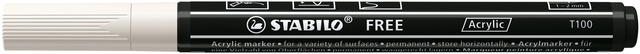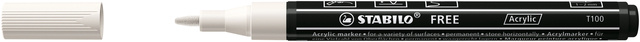* De STABILO FREE Acrylic Marker laat je creatieve ideeën op vele manieren de vrije loop. * Personaliseer oppervlakken, probeer het zelf en verlaat je comfortzone. * Jij bepaalt de regels. * Of het nu op papier, karton, plastic, canvas, steen, leer, of meer is.* De T100 heeft een dunne, scherpe punt voor fijne details en precieze lijnen, met een lijndikte van 1-2 mm, de T300 heeft een robuuste ronde punt van 2-3 mm en de T800 een grote beitelpunt van 2-10 mm. * Als een nieuwe punt gewenst is, kan de punt van de modellen T100 en T300 eenvoudig worden verwijderd uit de acrylmarker en worden omgedraaid om het andere uiteinde van de punt te gebruiken. * De marker is eenvoudig in gebruik: * 1. Schud de gesloten pen krachtig gedurende 30 seconden met de dop gesloten totdat de balletjes die erin zitten vrij kunnen bewegen. Hierdoor worden de pigmenten gelijkmatig verdeeld. * 2. Druk de punt 1-2 keer op een vel papier en laat de verf in de punt lopen. * 3. Ga los! * Acryl marker met gepigmenteerde inkt, droogt satijn mat op. * Dekkend, lichtecht en permanent op verschillende ondergronden. * Kleur kan worden gemengd en geblend als het nat is, droge lagen kunnen worden overschilderd. * De penbehuizing is gemaakt van meer dan 50% gerecycled plastic, de kartonnen verpakking is gemaakt van FSC®-gecertificeerd karton.* 3 modellen met verschillende punten en verschillende kleuren.* Schrijfkleur: wit. Alles is mogelijk! De veelzijdige acrylmarker maakt indruk met zijn opvallende STABILO design en vertrouwde STABILO kwaliteit.