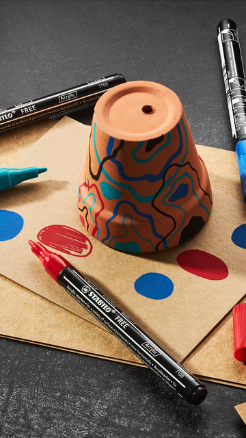 * De STABILO FREE Acrylic Marker laat je creatieve ideeën op vele manieren de vrije loop. * Personaliseer oppervlakken, probeer het zelf en verlaat je comfortzone. * Jij bepaalt de regels. * Of het nu op papier, karton, plastic, canvas, steen, leer, of meer is.* De T100 heeft een dunne, scherpe punt voor fijne details en precieze lijnen, met een lijndikte van 1-2 mm, de T300 heeft een robuuste ronde punt van 2-3 mm en de T800 een grote beitelpunt van 2-10 mm. * Als een nieuwe punt gewenst is, kan de punt van de modellen T100 en T300 eenvoudig worden verwijderd uit de acrylmarker en worden omgedraaid om het andere uiteinde van de punt te gebruiken. * De marker is eenvoudig in gebruik: * 1. Schud de gesloten pen krachtig gedurende 30 seconden met de dop gesloten totdat de balletjes die erin zitten vrij kunnen bewegen. Hierdoor worden de pigmenten gelijkmatig verdeeld. * 2. Druk de punt 1-2 keer op een vel papier en laat de verf in de punt lopen. * 3. Ga los! * Acryl marker met gepigmenteerde inkt, droogt satijn mat op. * Dekkend, lichtecht en permanent op verschillende ondergronden. * Kleur kan worden gemengd en geblend als het nat is, droge lagen kunnen worden overschilderd. * De penbehuizing is gemaakt van meer dan 50% gerecycled plastic, de kartonnen verpakking is gemaakt van FSC®-gecertificeerd karton.* 3 modellen met verschillende punten en verschillende kleuren.* Schrijfkleur: zwart. Alles is mogelijk! De veelzijdige acrylmarker maakt indruk met zijn opvallende STABILO design en vertrouwde STABILO kwaliteit.