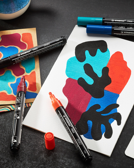* De STABILO FREE Acrylic Marker laat je creatieve ideeën op vele manieren de vrije loop.* Personaliseer oppervlakken, probeer het zelf en verlaat je comfortzone. * Jij bepaalt de regels. * Of het nu op papier, karton, plastic, canvas, steen, leer, of meer is. * De T300 heeft een robuuste ronde punt van 2-3 mm. Als een nieuwe punt gewenst is, kan de punt van de modellen eenvoudig worden verwijderd uit de acrylmarker en worden omgedraaid om het andere uiteinde van de punt te gebruiken. * De marker is eenvoudig in gebruik: * 1. Schud de gesloten pen krachtig gedurende 30 seconden met de dop gesloten totdat de balletjes die erin zitten vrij kunnen bewegen. Hierdoor worden de pigmenten gelijkmatig verdeeld. * 2. Druk de punt 1-2 keer op een vel papier en laat de verf in de punt lopen. * 3. Ga los! * Acryl marker met gepigmenteerde inkt, droogt satijn mat op. * Dekkend, lichtecht en permanent op verschillende ondergronden. * Kleur kan worden gemengd en geblend als het nat is, droge lagen kunnen worden overschilderd. * De penbehuizing is gemaakt van meer dan 50% gerecycled plastic, de kartonnen verpakking is gemaakt van FSC®-gecertificeerd karton. * 3 modellen met verschillende punten en verschillende kleuren. * Schrijfkleur: karmijnrood. Alles is mogelijk! * De veelzijdige acrylmarker maakt indruk met zijn opvallende STABILO design en vertrouwde STABILO kwaliteit.